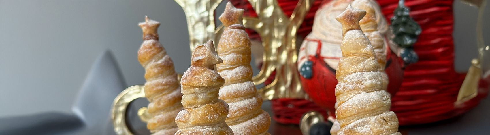 Extiende la pasta de hojaldre en un rectángulo de 60 cm x 25 cm, corta tiras de 2.5 cm de ancho. Barniza cada una con huevo batido. Enrolla desde la base de cada cono, una de las tiras de hojaldre, subiendo hasta la punta. Asegúrate de que la punta esté bien presionada para que no se deforme. Con la pasta de hojaldre restante, corta pequeñas estrellas para los arbolitos.